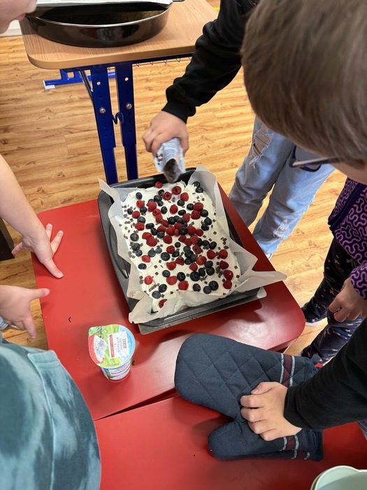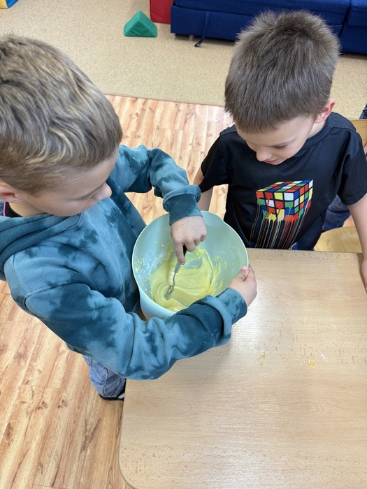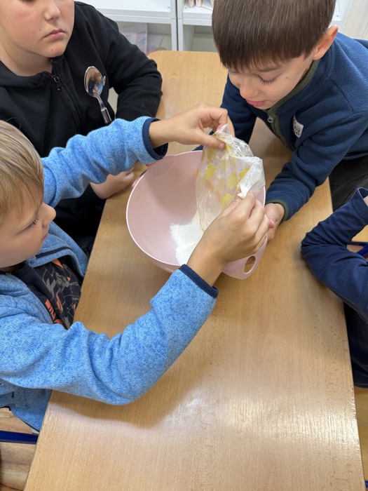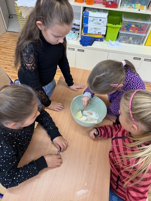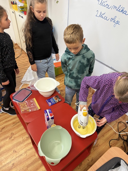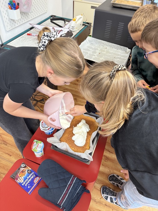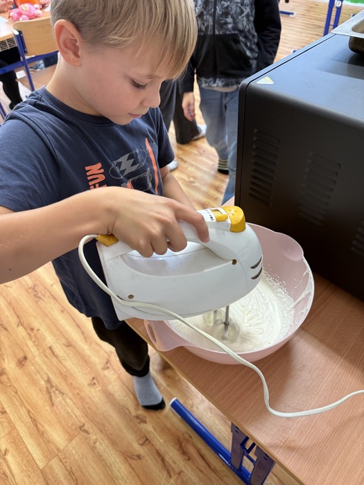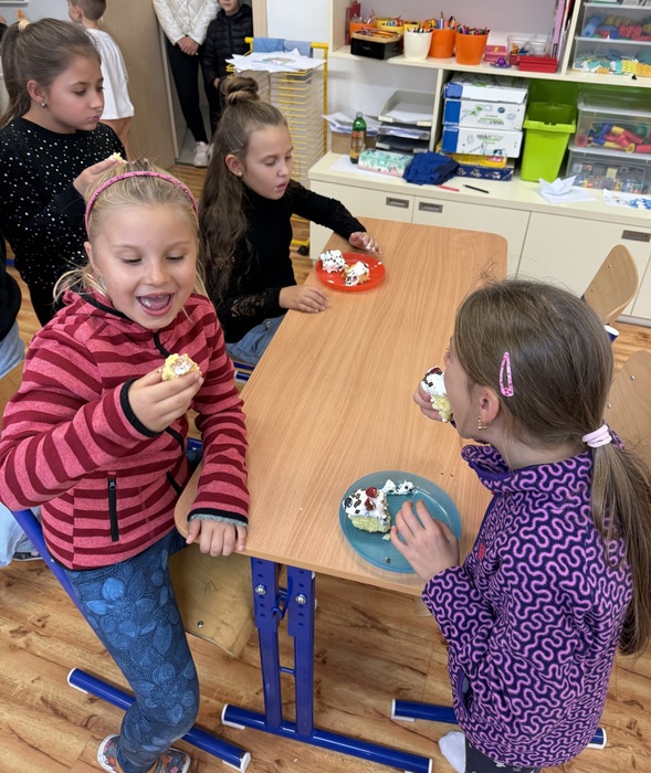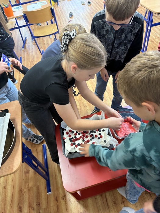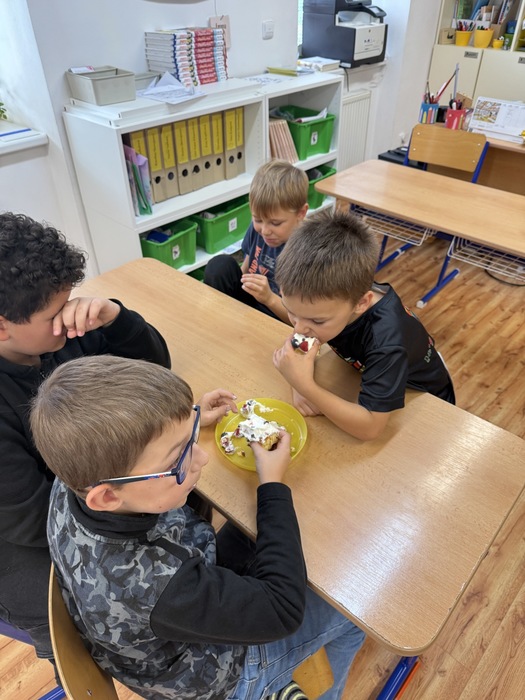 V úterý jsme si v družině zpříjemnili odpoledne oslavou Národního dne dezertů. Pekli jsme ovocný moučník – děti pomáhaly s přípravou těsta, chystáním ovoce i zdobením. Všude to krásně vonělo a na závěr jsme si náš výtvor s chutí snědli. Bylo to moc fajn sladké odpoledne!